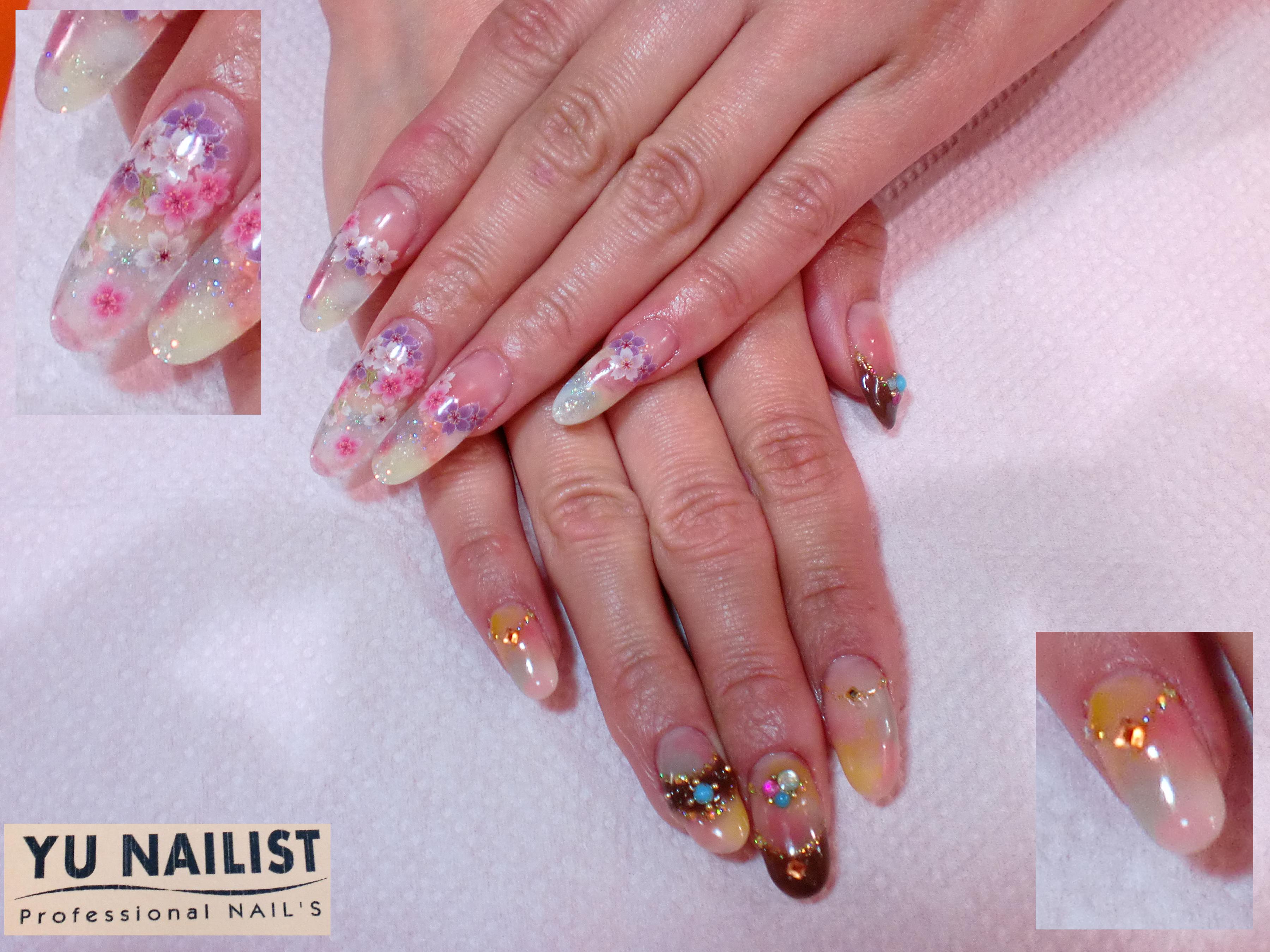 アクリルのスカルプのマーブルに桜のステッカーもりもりです。