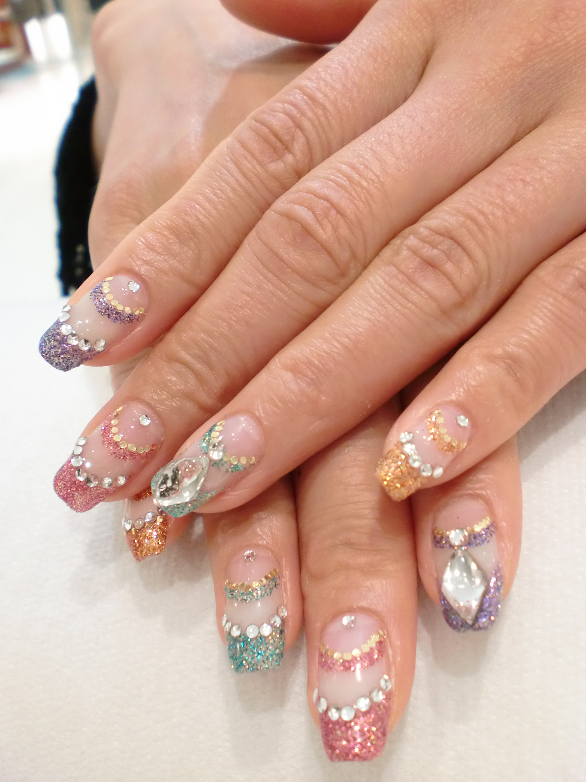 5色の違うお色でフレンチネイルにストーンを ふんだんにのせました。