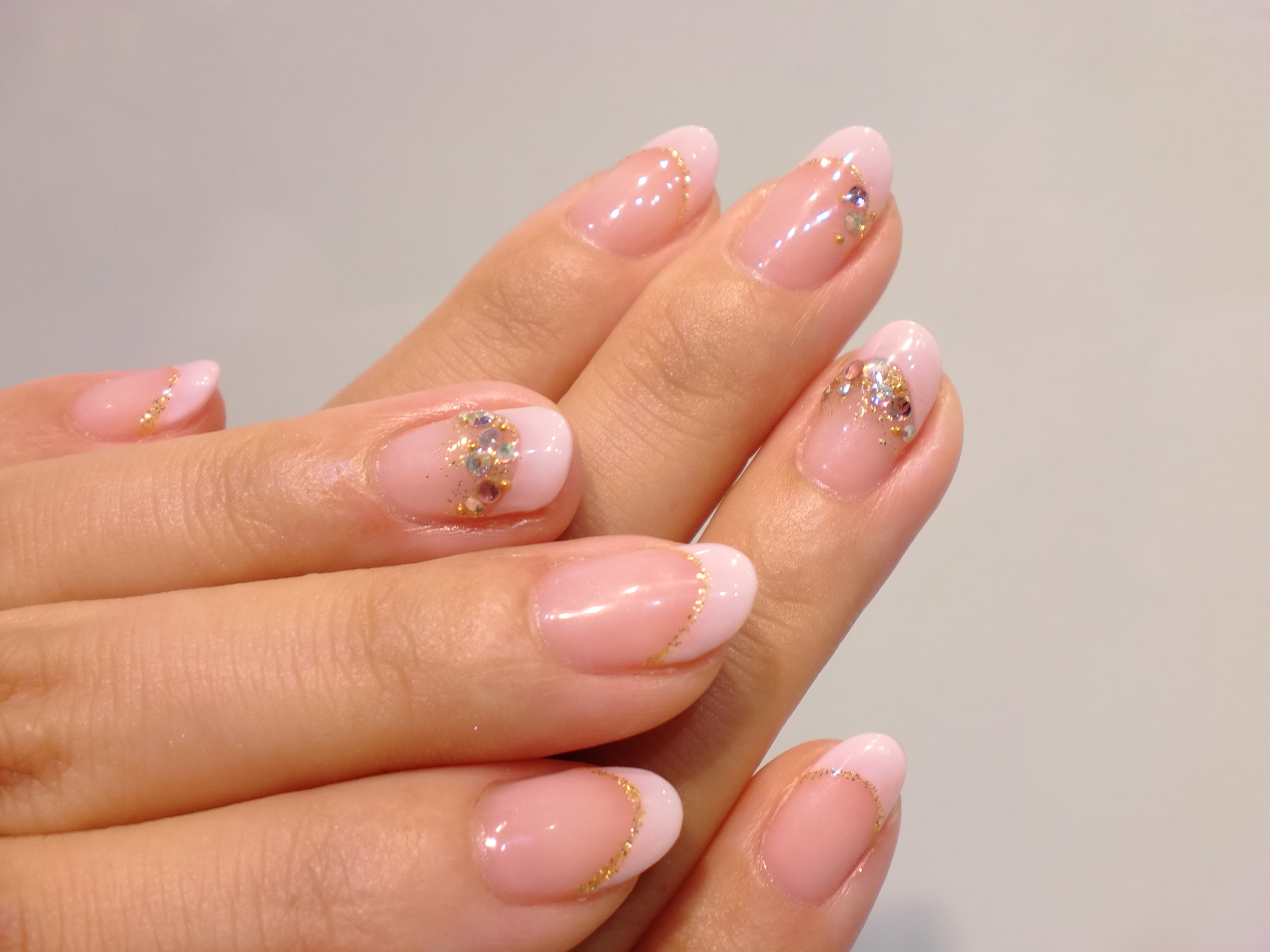 ピンクのフレンチにゴールド×ライン・ラインのキワにストーンを少し置きました。